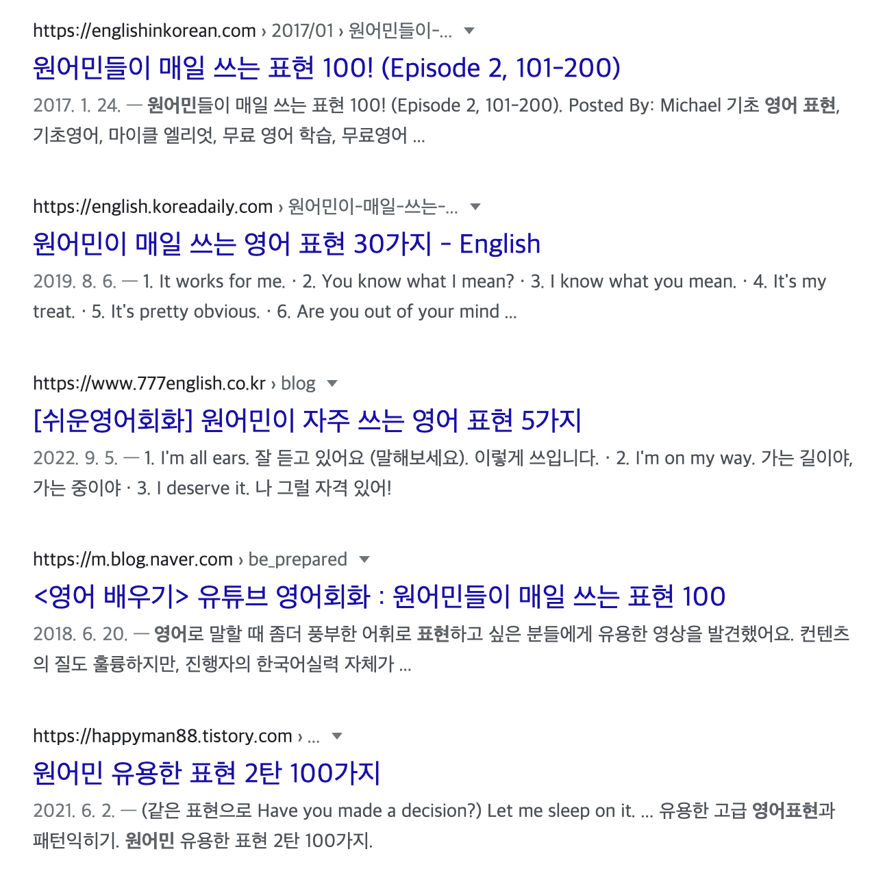 그래서 저는 "원어민 영어 표현"이라는 키워드로 구글링을 해보면서 원어민식 표현들을 공부하기 시작했습니다. 구글링을 해보면 아래 사진처럼 엄청나게 많은 관련 글들이 나오죠. 아무거나 들어가서 보셔도 실생활에서 원어민들이 쓰는 표현들을 많이 알려줍니다. 파파고 공부법과는 달리 내가 떠올린 표현이 아니라는 점에서 아쉽긴 하지만 나름 도움이 되었습니다.