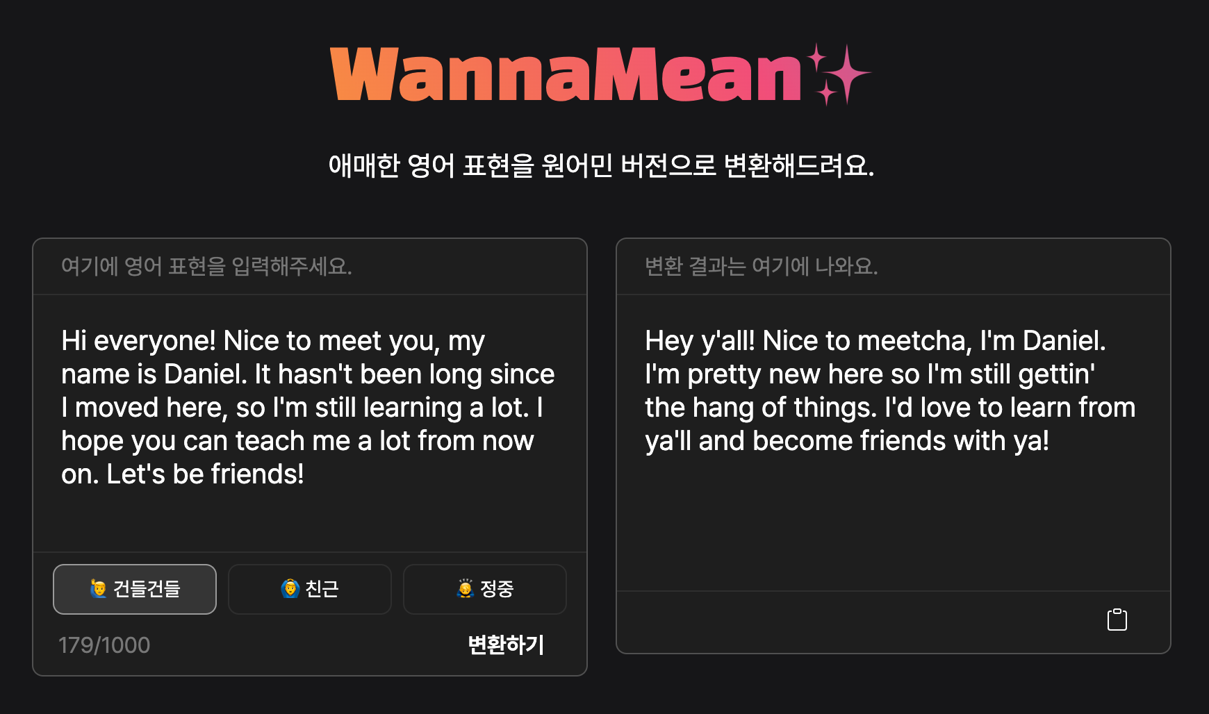 그래서 직접 만들어보았습니다! 이름은 WannaMean(원어민)이에요.