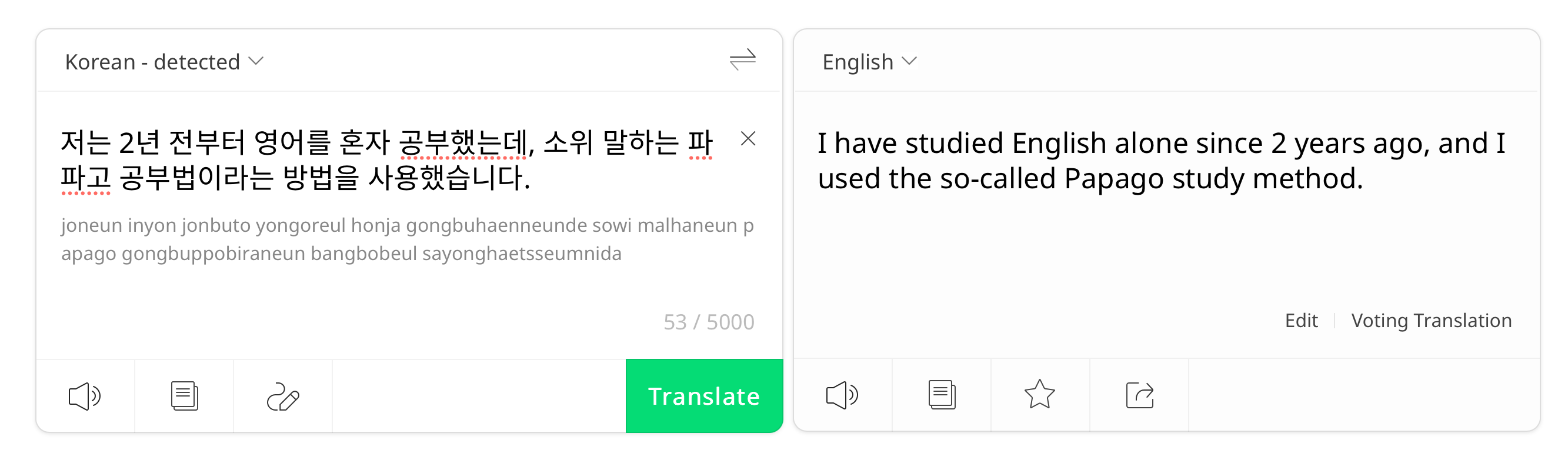 파파고 공부법의 이러한 한계는 맨 위에서 제가 스킵한 2번 과정을 거친다고 해도 해결되지 않았습니다. 제가 겪는 문제는 좀 더 실생활에서 사용하기에 자연스러운 원어민 버전 표현을 알고 싶어서 그런 것이지, 파파고가 알려준 표현 자체가 잘못되어서가 아니니까요.