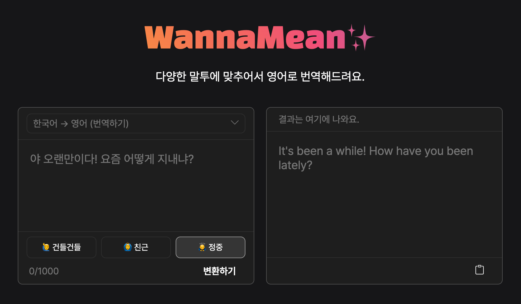 이제 자연스러운 번역이 필요하실 때는 wannamean 번역기를 써보세요! 🙆♂️🤖🍀