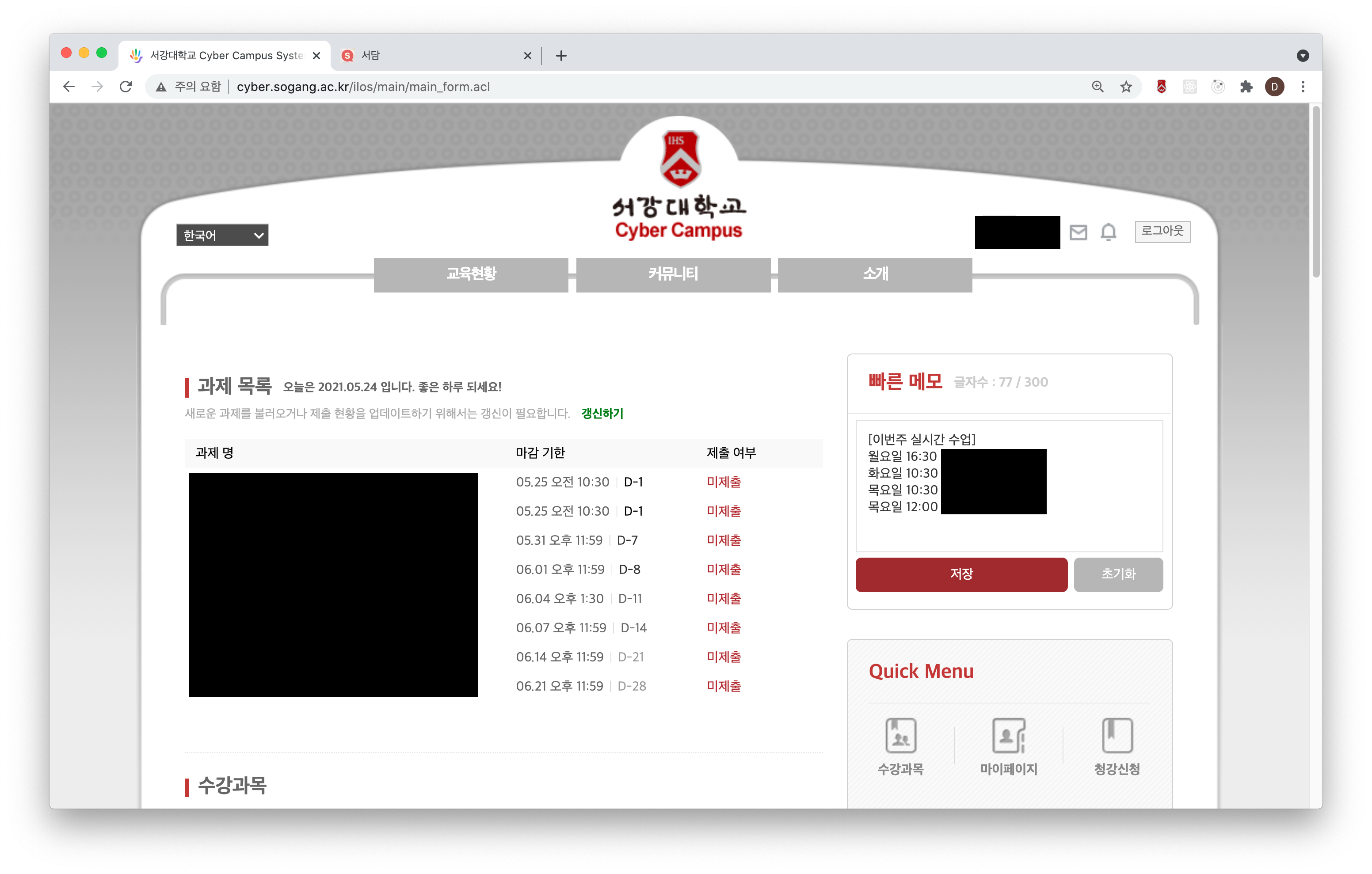 - 3월 27일 (1.1) : 마감된 과제는 보여주지 않습니다. 색을 사용해 가독성을 높였습니다. 기존의 cyber.sogang.ac.kr 뿐만 아니라 eclass.sogang.ac.kr에서도 사용할 수 있습니다.